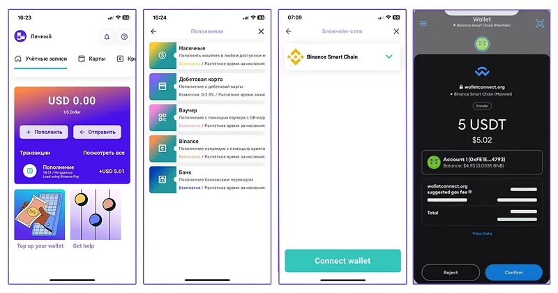 - Легкое и быстрое пополнение криптовалютой (Binance и др.)